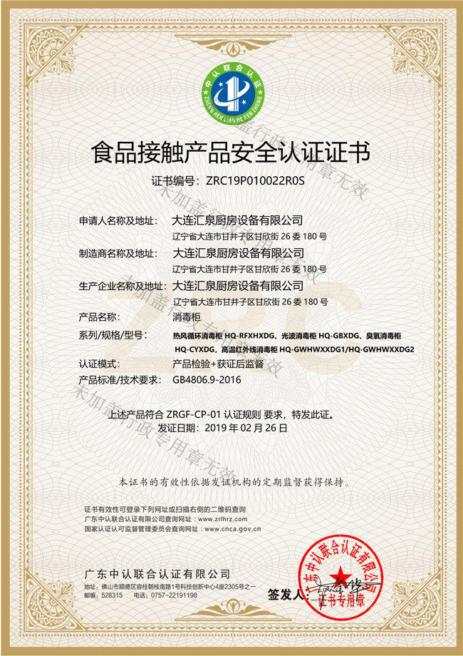 消毒柜食品接觸認證證書