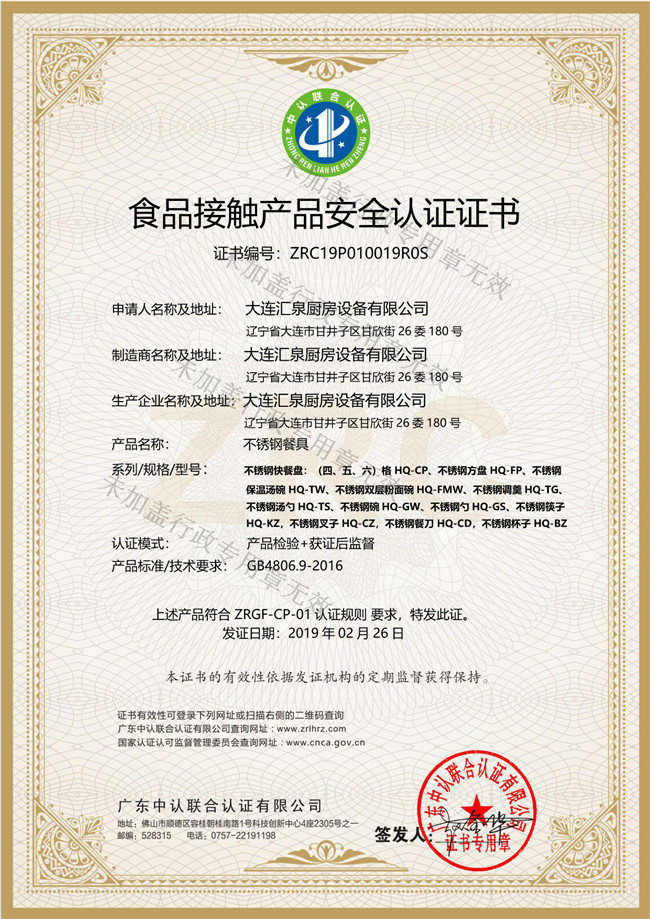 不銹鋼餐具食品接觸認(rèn)證證書(shū)